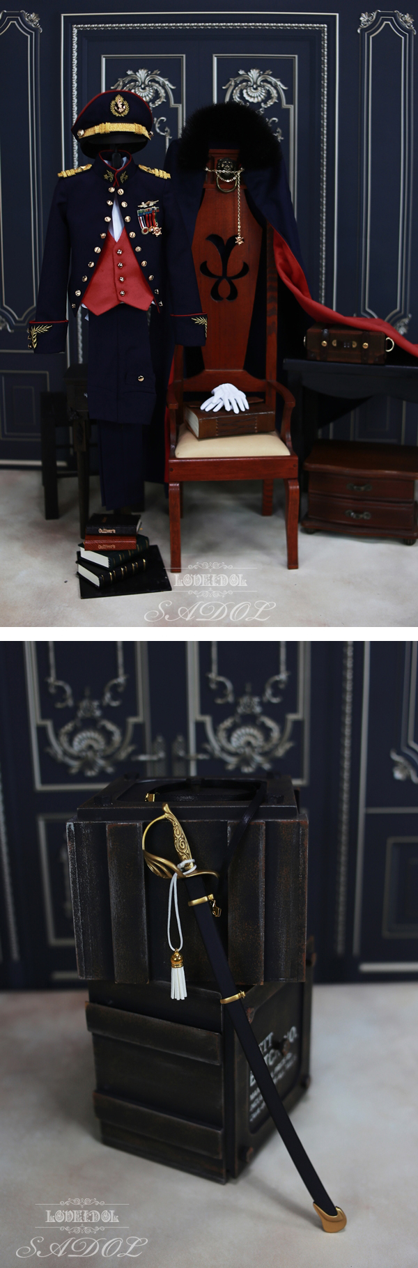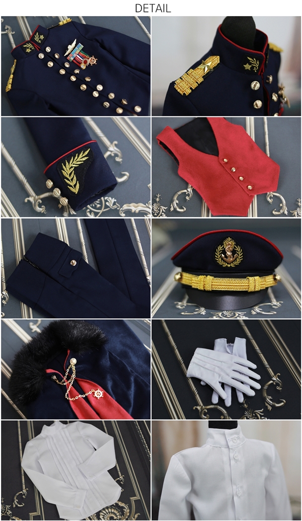 * Including : Navy Banquet Hat + Navy Banquet Cloak + Navy Banquet Jacket + Epaulets + Detachable Medal Set + Suede Vest + Pin Tuck Shirt + Cummer Band Pants + Gloves + 2 Hangers